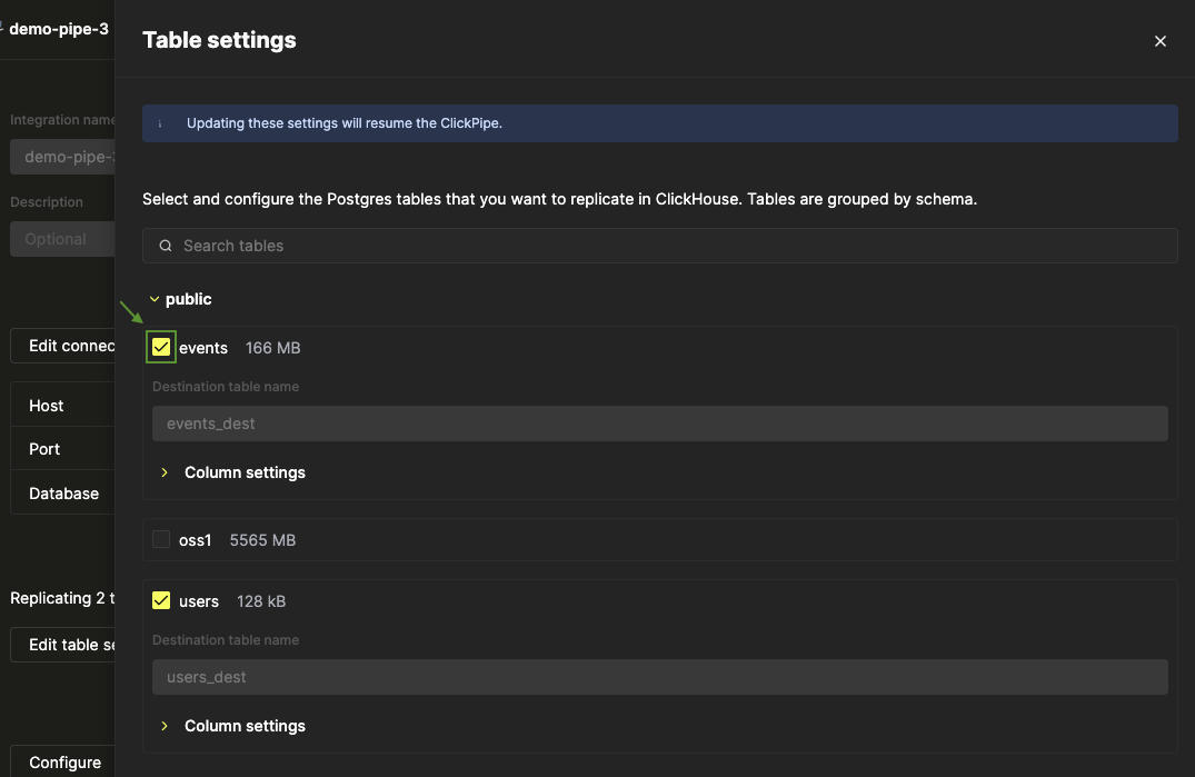 Удаление отдельных таблиц из ClickPipe